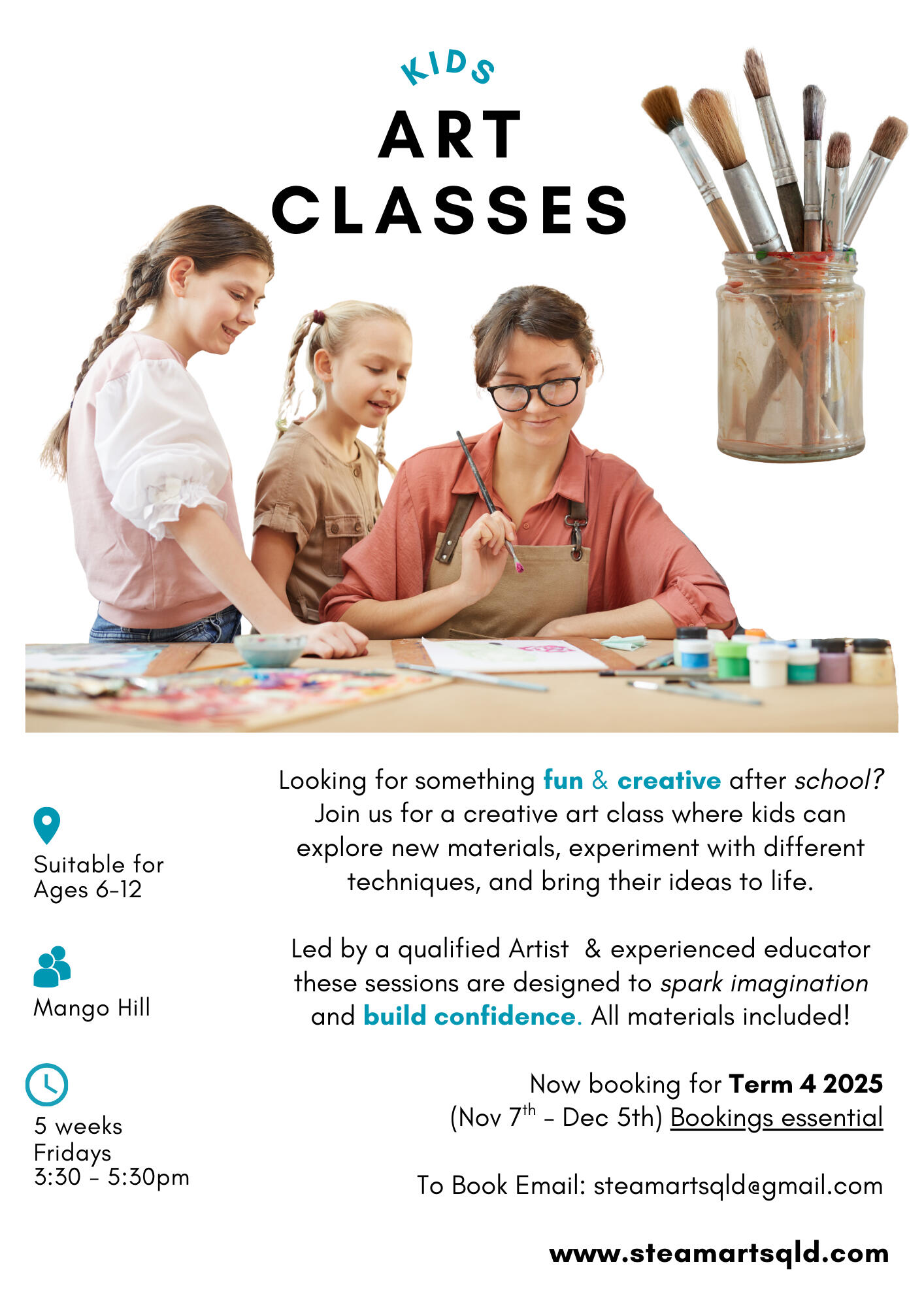 Looking for something fun & creative after school? Join us for a creative art class where kids can explore new materials, experiment with different techniques, and bring their ideas to life.Led by a qualified Artist & experienced educator these sessions are designed to spark imagination and build confidence. All materials included!Now booking for Term 4 2025